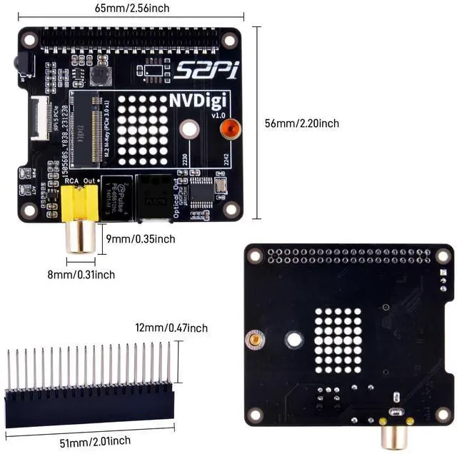 The NVdigi is a versatile expansion board designed for the Raspberry Pi 5, combining the capabilities of the HiFi Digi for high-quality S/PDIF audio output and an M.2 PCIe x1 slot to accommodate NVMe 2242/2230 SSDs. This multifunctional board enhances both the audio and storage capabilities of your Raspberry Pi 5.