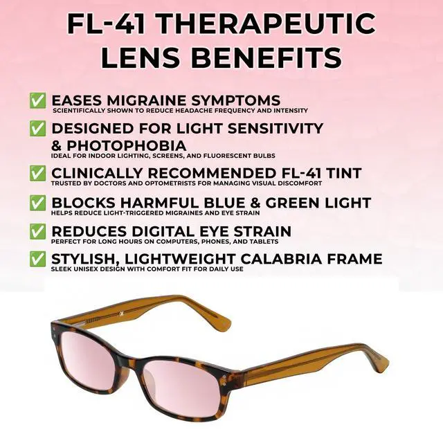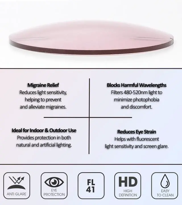 FL-41 Rusty Rose Pink Lenses: Block flickering blue light to help alleviate migraines and eye strain, providing a soothing effect for indoor lighting & sensitive settings. Winter Sun Light Golden Yellow Lenses: Brighten your day with improved contrast & energy levels. Practical for outdoor activities under low light.