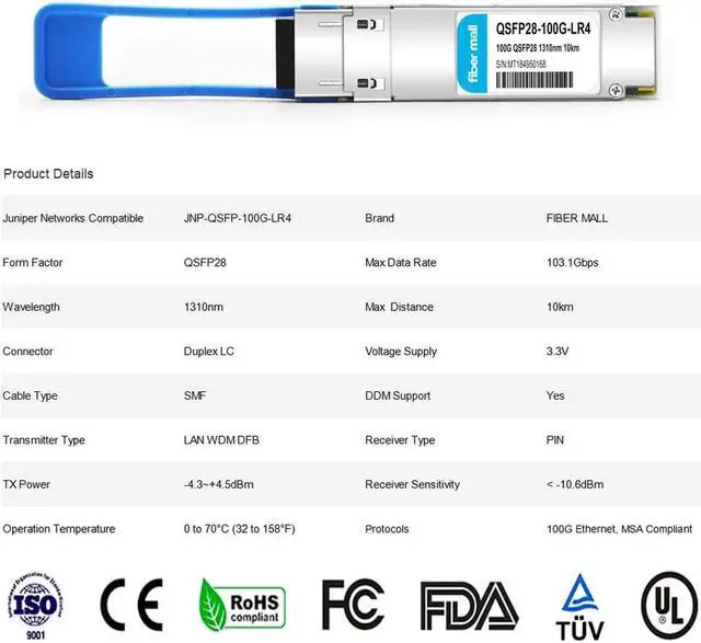 100G QSFP28 LR4 for Juniper Networks JNP-QSFP-100G-LR4, 100GBASE-LR4 QSFP28 Optical Transceiver Module, 1310nm 10km LAN WDM LC SMF DOM