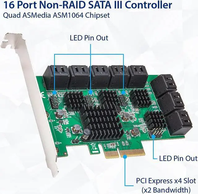 Supports 16 port 6Gb/s SATA III interface, Supports Port Multiplier, Supports Hot-Plug, Supports drive power control and staggered spin-up. Supports SATA Partial / Slumber power management state. ASM1064, a SATA host controller (AHCI) with upstream PCIe Gen3 x1 and downstream four SATA Gen3 ports. It's a low latency, low cost and low power AHCI controller. With four SATA ports and cascaded port multipliers, ASM1064 can enable users to build up various high speed IO systems, including server, high capacity system storage or surveillance platforms. ASMedia PCIe product ASM2806, a low latency, low cost and low power 6 lane, maximum 4 downstream ports packet switch.
