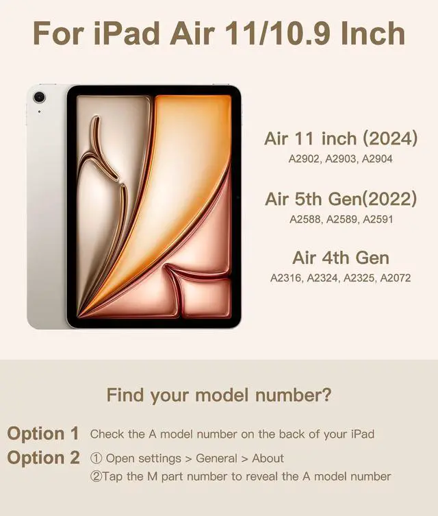 [(Perfect Compatibility)] Specially designed Compatible with iPad Air 11-inch (M2) 2024 (Model Number: A2902/AA2903/A2904), for Air 5th Generation 2022 (A2588/A2589/A2591), for Air 4th Generation 2020 (A2316/A2324/A2325/A2072), this keyboard case offers precise cutouts for all ports, buttons, and cameras, seamless access to all features without removing it. Please find the No. "AXXXX" of your tablet before order(Open settings > General > About, Tap the M part number to reveal the A model number)