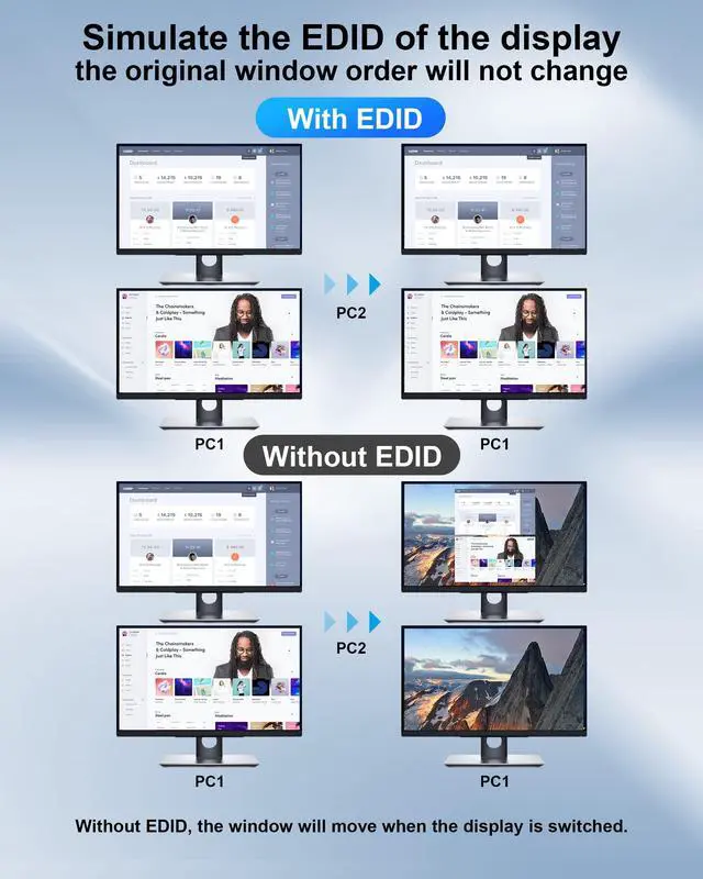 With Simulation EDID: This KVM dual monitor switch can simulate the EDID of the display, and store the resolution and refresh rate of the display, it comes with EDID emulators in each input port, keeping PCs always having correct display information. Without EDID, your windows may move around when switching. No longer have to sit and wait for the windows to adjust. Another feature of EDID is the ability to automatically identify the best resolution.