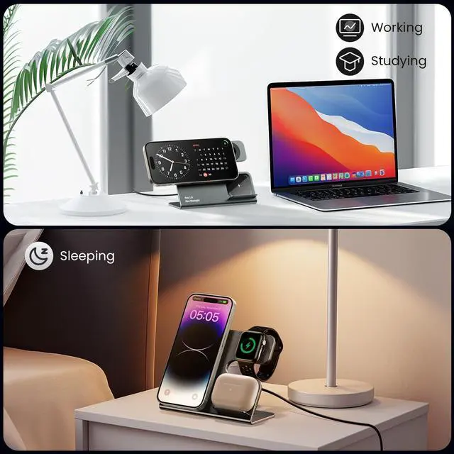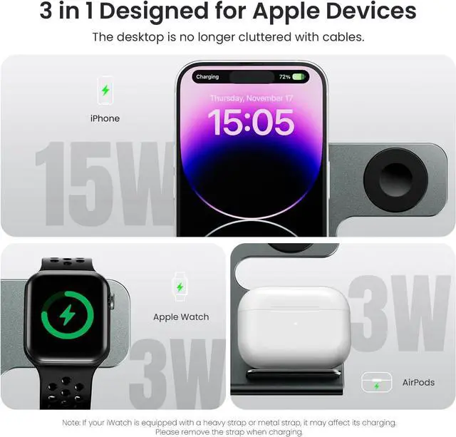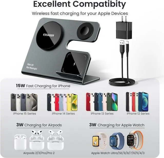 3-in-1 Magnetic Wireless Charging Station: Supports simultaneous charging for AirPods, iPhone, and Apple Watch. Compatible with iPhone 16, 15, 14, 13, 12 series and above, Apple Watch Series 9, 8, 7, 6, 5, 4, 3, 2, SE, AirPods 2, 3, 4, Pro, Pro 2. It can also charge other phones support Qi wearing magnetic phone case