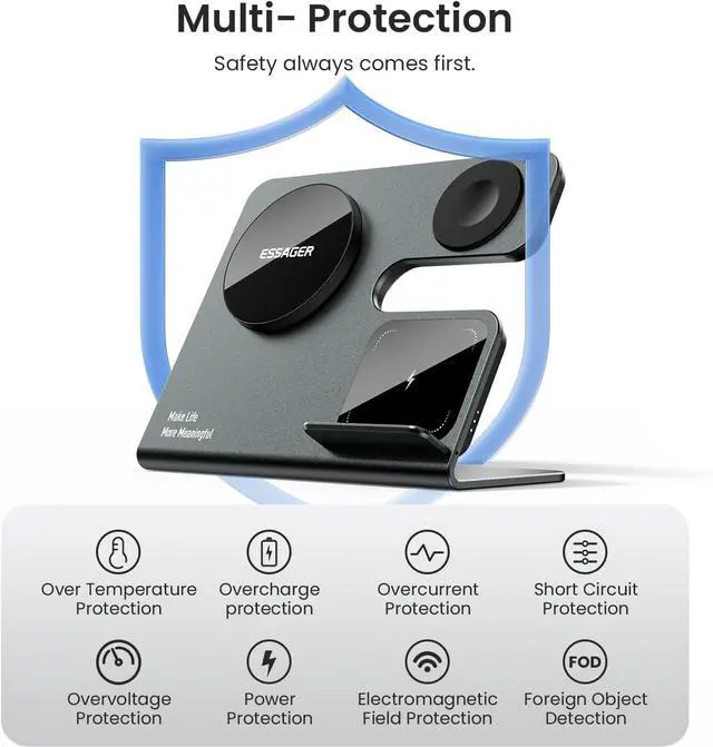 Safe Wireless Charging Base: Incorporates overcurrent, overvoltage, overheat protection, and foreign object detection to prevent overcharging and safeguard device battery health