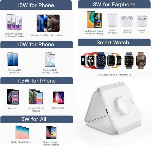 15W 3 in 1 Wireless Charger: foldable charging station is suitable for iphone 8/X/11/12/13/14/15/16 series, and all devices that support wireless charging (such as headphones that support wireless charging). You can charge both your iPhone, iWatch and Airpods pro simultaneously, saving space and making your desktop cleaner