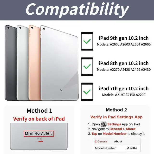 COMPATIBLE MODELS: This iPad 10.2 inch case is designed for iPad 9th generation case 2021/iPad 8th generation case 2020/iPad 7th generation case 2019. The compatible models are A2602, A2603, A2604, A2605, A2430, A2270, A2428, A2429, A2197, A2198, A2200.