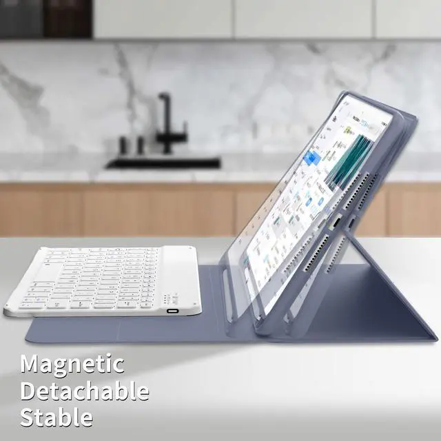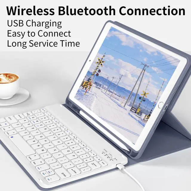 MAGNETIC AND DETACHABLE KEYBOARD: This keyboard case for iPad 9/8/7 2021/2020/2019 comes with a magnetic keyboard, which can transform your tablet into a laptop. The keyboard is detachable, and it supports bluetooth connecting. You can carry our iPad keyboard case outside for working or playing.