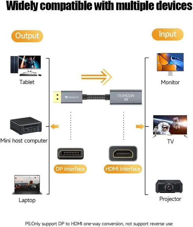 [Note!!! ]: This DisplayPort to HDMI Adapter is NOT bi-directional. It only converts an DisplayPort signal (source device) to HDMI (monitor/display). DO NOT use for HDMI devices to DP monitor. This Display to HDMI cable also support DP, DP++, DisplayPort++.