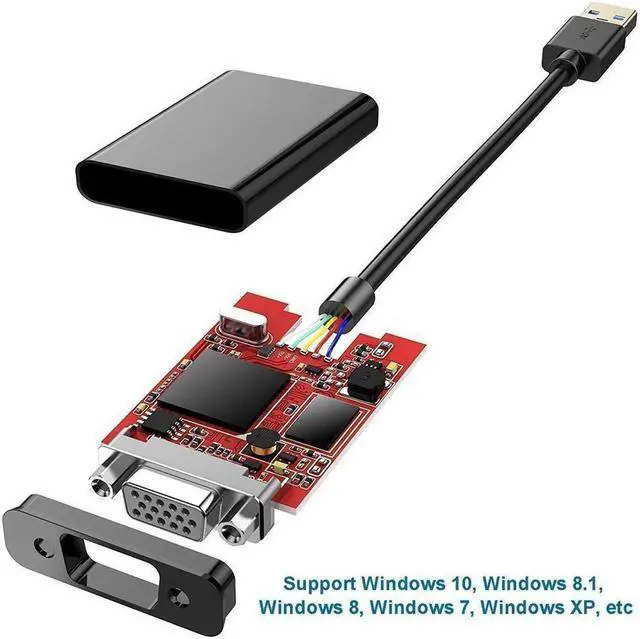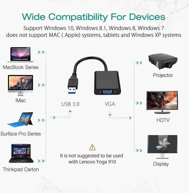 Highlights: Range Of Application This USB 3.0 to VGA Adapter is used to connected a USB-enabled devices( such as laptop, desktop) with a VGA-enabled devices( such as monitor, projector, TV) for multi-monitor solution, extending working space with split-screen, mirroring display, etc High Resolution Functions like an external graphics card offering flawless high definition video transmission to your monitor or projector. Supports up to 1920 x 1080 for compatibility with most displays, monitors and projectors with VGA. To ensure high resolution output, make sure that the USB port supports USB 3.0 to enable high resolution support. USB 3.0 Interface, Fast Transmission. Leverages the adoption of USB 3.0 providing fast and smooth signal transmission. Backward compatible with USB 2.0 computers. Wide Compatibility. Support Windows 10, Windows 8.1, Windows 8, Windows 7, Windows XP, etc, No need to install CD.