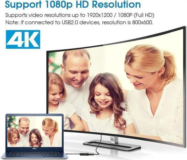 Product description Color: Black DESCRIPTION This USB 3.0 to VGA Adapter is used to connected a USB-enabled devices( such as laptop, desktop) with a VGA-enabled devices( such as monitor, projector, TV) for multi-monitor solution, extending working space with split-screen, mirroring display, etc HIGH RESOLUTION If connected to USB 3.0 devices, resolution is adjustable and the maximum resolution can be up to 1920x1080@60Hz (1080p), if connected to USB 2.0 devices, resolution is 800x600@60Hz. HIGHLIGHTS Leverages the adoption of USB 3.0 providing fast and smooth signal transmission. Backward compatible with USB 2.0 computers. COMPATIBLE LIST PC Laptop Windows 7/8/ 8.1 /10, Desktop, Laptop, PC, Monitor, Projector, HDTV, Chromebook, Raspberry Pi, Roku, Xbox and More BUILT-IN DRIVER No need to install CD. INSTRUCTIONS 1. Insert the device into the computer USB 3.0 interface. Connect second monitors and devices to the VGA connection line. 2. Look up and run FL00. EXE in the device disk. Restart the computer after the installation is completed. 3. After reboot, the second monitors correctly display the image. 3.