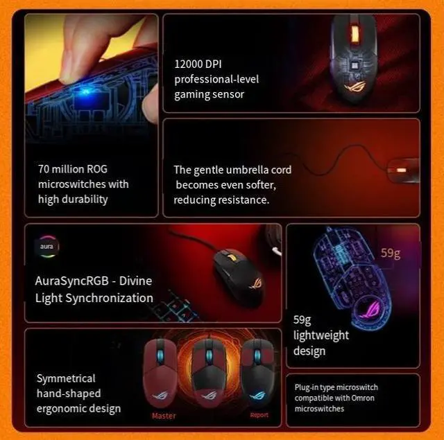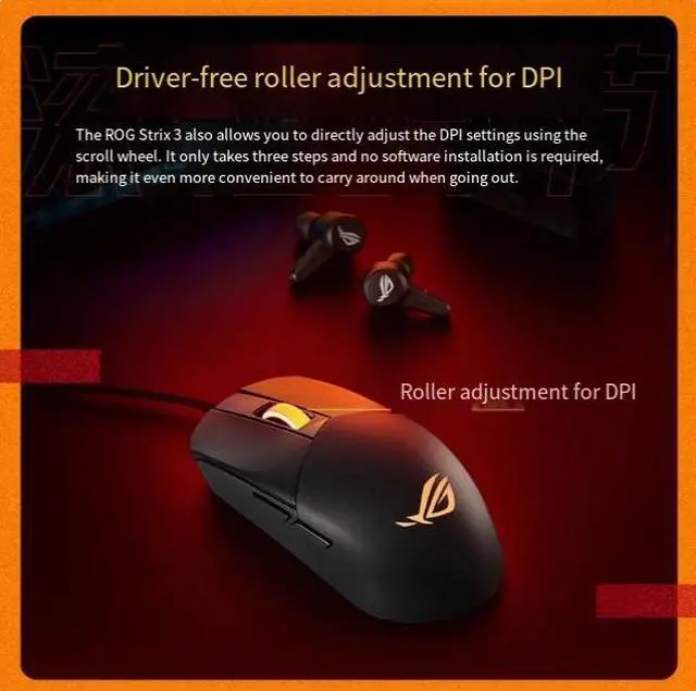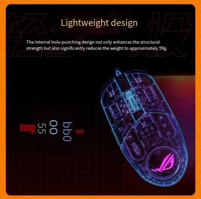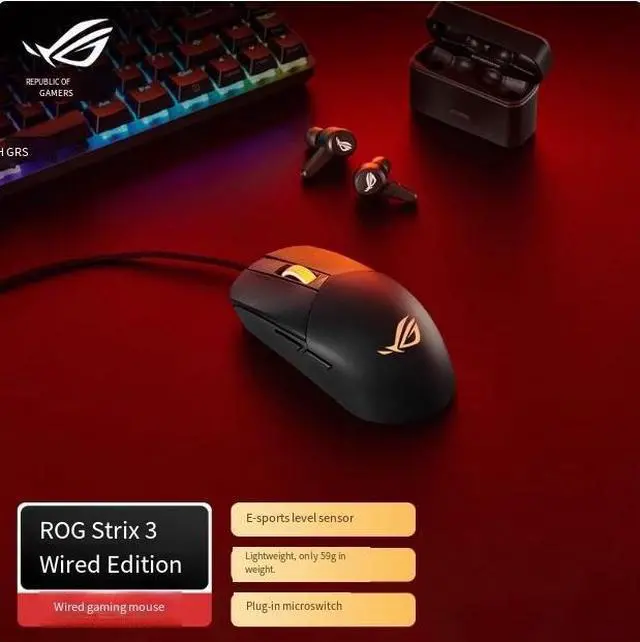 The R0 G Strix 3 Wired Gaming Mouse features a lightweight design with a symmetrical hand shape and synchronized LED lighting. ltis a lightweightproduct from ASUS