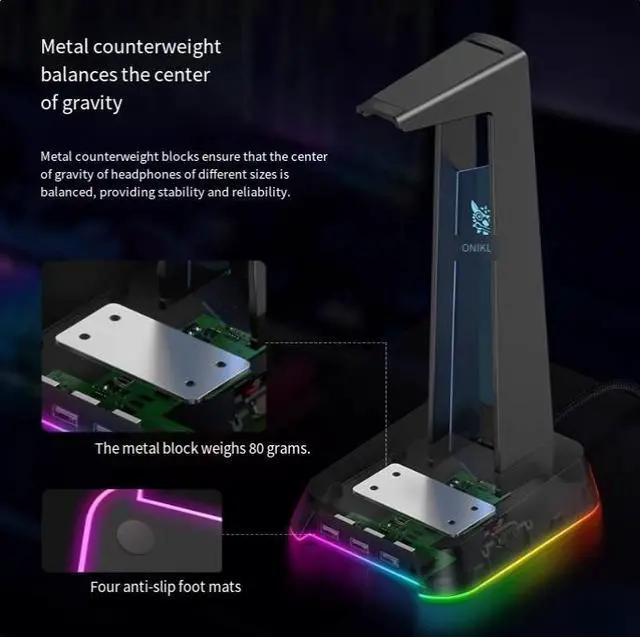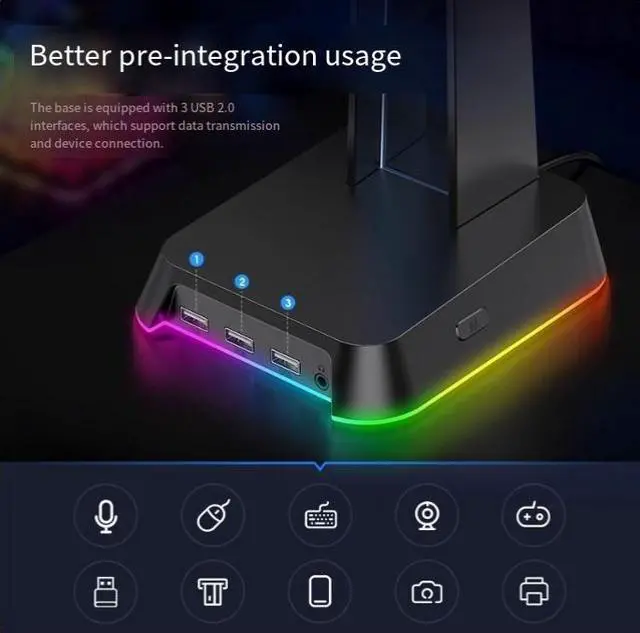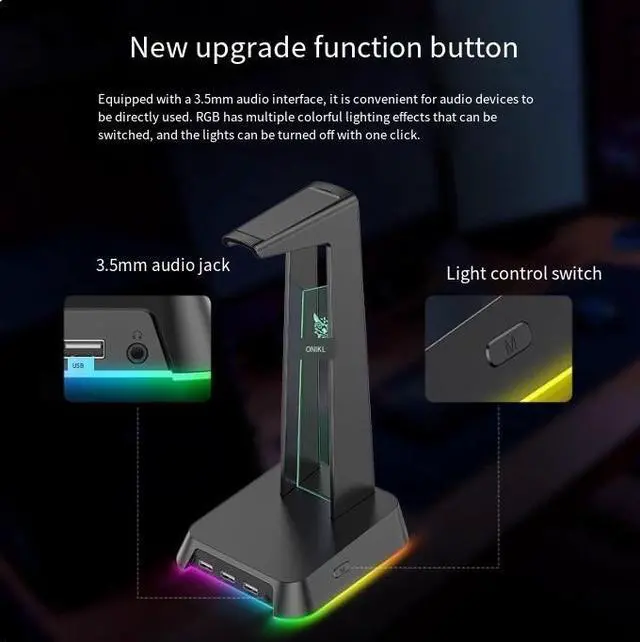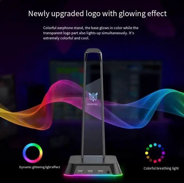 Newly upgraded logo with glowing effect Colorful earphone stand, with the base emitting colorful light at the same time The transparent parts of the LOGO emit light simultaneously, creating a dazzling and colorfuleffect.