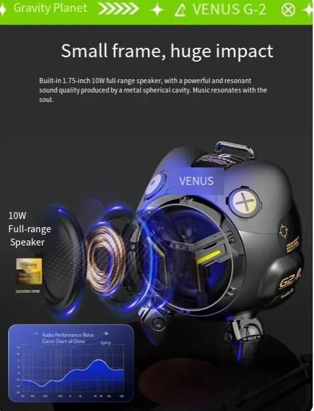 VENUS. SPEAKER delivers a powerfu! impact with its compact size. Built-in 1.75 -inch 10W full-range speaker, with a powerful and resonantsound quality produced by a metal spherical cavity. Music resonateswith the soul.