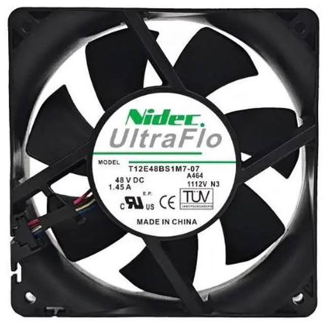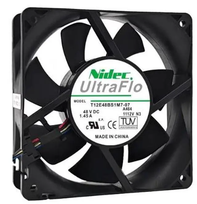 Brand: NidecModel:T12E48BS1M7-07Size:120*120*38MMVoltage: DC 48VCurrent: 1.45APower: 69.6WSpeed: 6400 RPMWeight: 0.329 kg