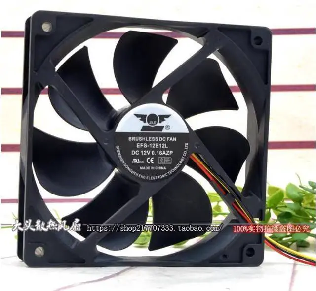 Brand: JielengModel: EFS-12E12LSize:120*120*25MMVoltage: DC 12VCurrent:0.16ASpeed: 1600 RPMNoise: 28 dB(A)Air volume: 55 CFM