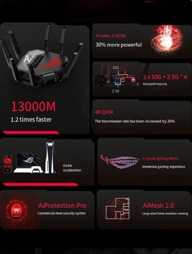 ROG RAPTURE-RevolutionarySpeed Experience 4096QAM enables the transmission of moredata at the same time, with the datatransmission rate increasing by 20%.