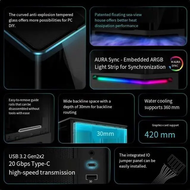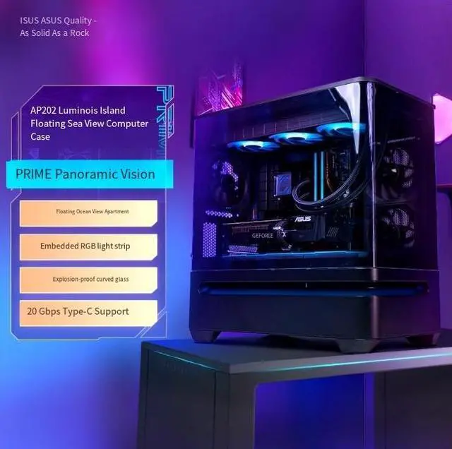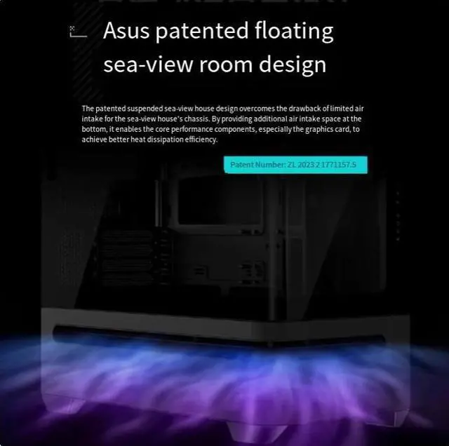 Asus' brand-new patented *floating design has eliminated the bottleneck of heatdissipation that was once a problem with "sea-View room" type cases. lt is alsoequipped with curved anti-shock glass, furtherenhancing the overall transparency andallowing the internal hardware to be fully visible.