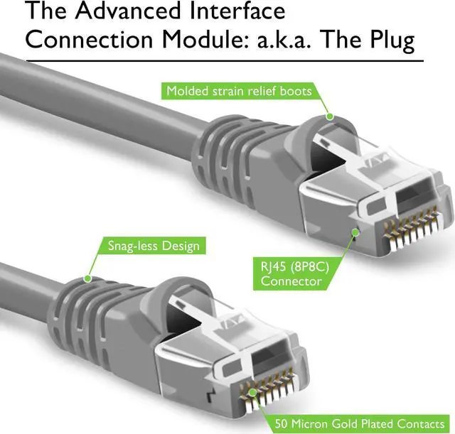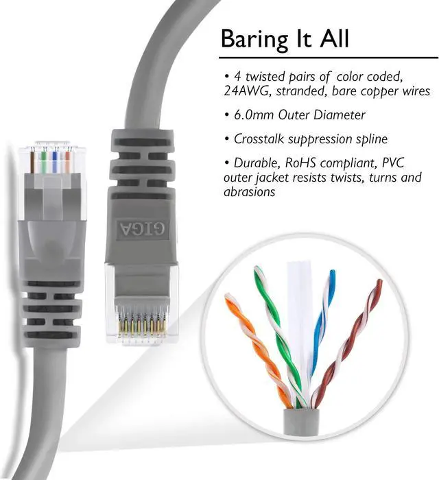 UTP 24AWG stranded conductors for flexibility, twisted in pairs and nested in a spline to minimize crosstalk, 50 micron gold-plated contacts for high-speed data transfer and corrosion resistance, as well as molded, snag-less strain relief boots for long lasting, durable connections