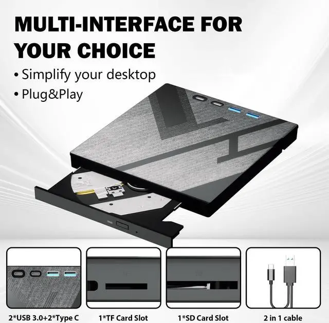• 7-in-1 External Blu-ray Drive: This offers versatile features. It has 1*SD card slot, 1*TF card slot, 2*Type-C ports, 1*USB 3.0+1*USB 2.0 ports,and 1*2-in-1 cable(usb3.0+type-c) for data transfer or charging purposes. It supports reading DVD/CD discs and writing DVD/CD discs. You can easily copy music, movies, and data files from SD cards, TF cards, or through the USB/Type-C ports to your computer. Please note that the SD card and TF card cannot be used simultaneously; you can only choose one at a time. However, both of them can function simultaneously with the USB 3.0 ports.