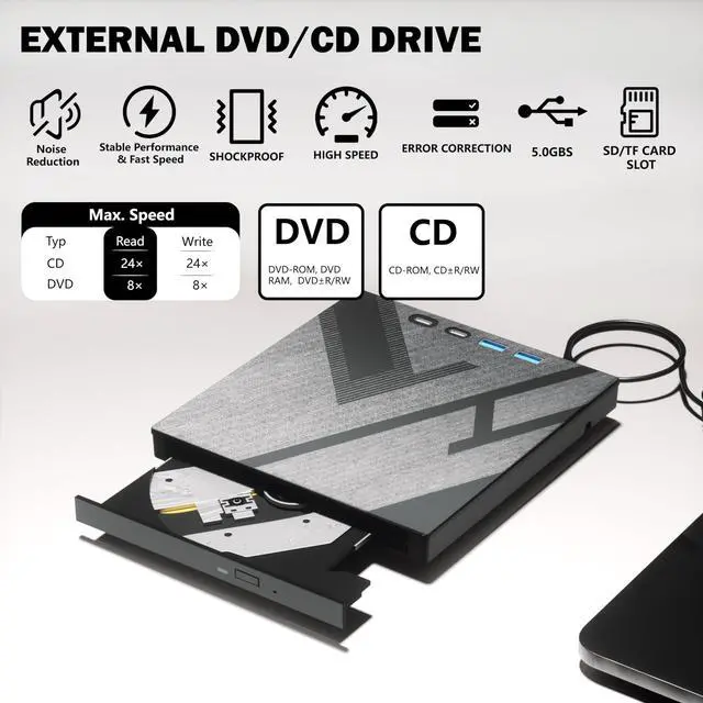 • [(Remarkable Writing & Reading Speed)] Each of our external cd/dvd drives is equipped with a brand-new movement for reliable performance. Boasting up to 8x DVD-R Write Speed and 24x CD Write Speed for outstanding performance and quick data accessibility.