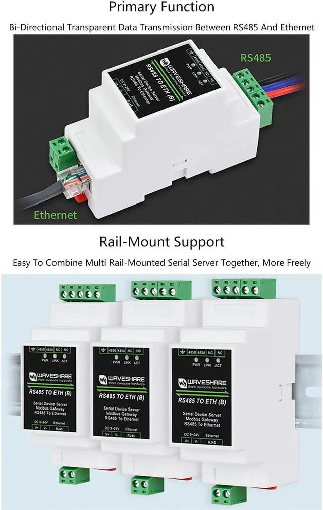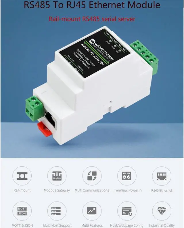 This is a RS485 device data acquisitor / IoT gateway designed for industrial environment. It combines multi functions in one, including serial server, Modbus gateway, MQTT gateway, RS485 to JSON, etc. The module features RS485 and Ethernet ports, uses screw terminals for power input, supports 9~24V wide range power supply. Rail-mount flame-retardant case design, small in size, easy to install.