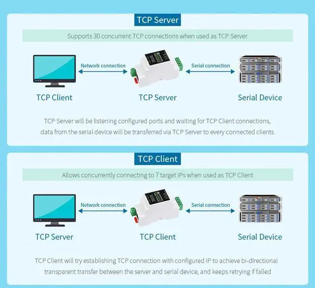 Operating mode--- TCP server, TCP client (coexisting with TCP server), UDP, UDP multicas