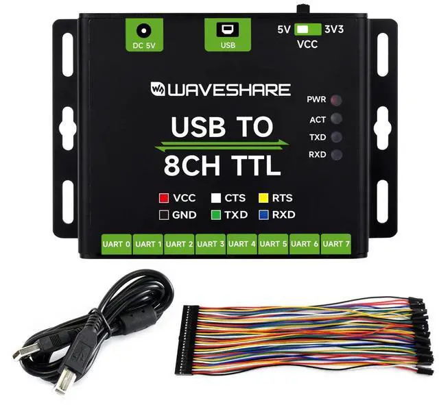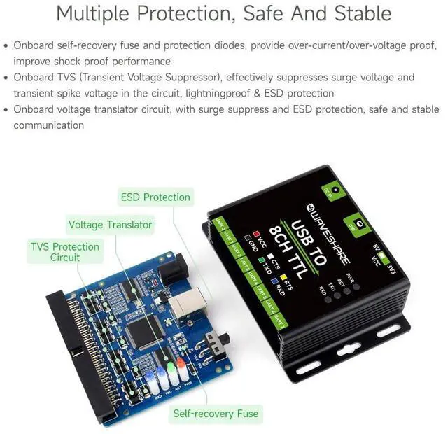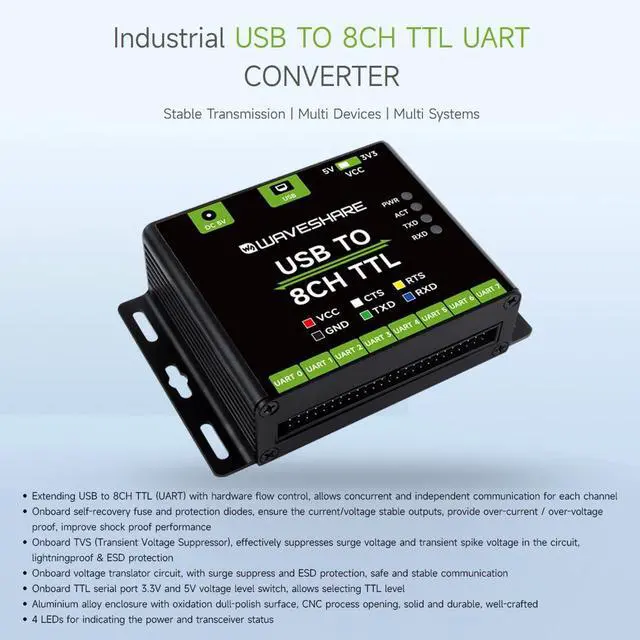 Waveshare Industrial USB to 8CH TTL Converter, USB to UART, Multi Protection Circuits, Multi Systems Support, USB to TTL Adapter