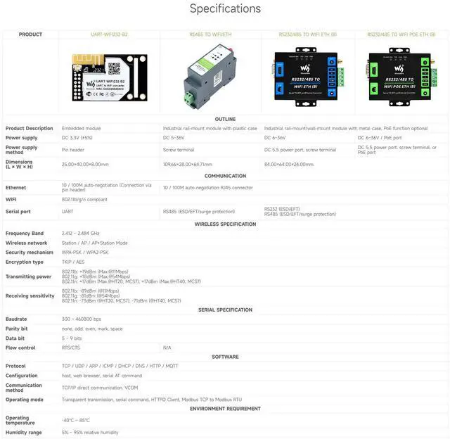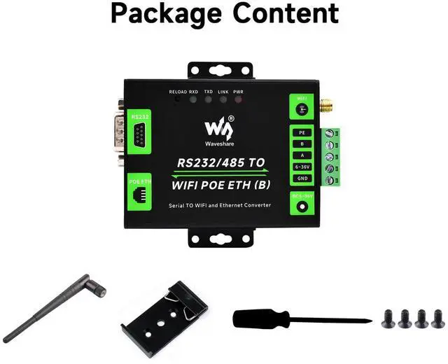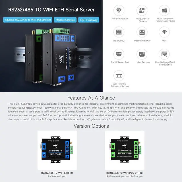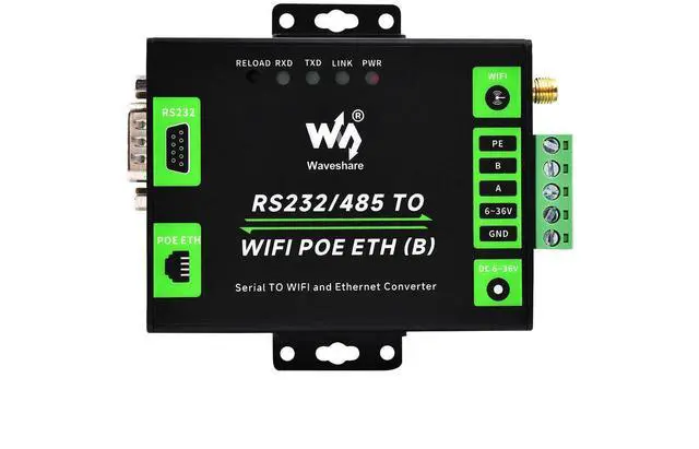 Waveshare Industrial Grade Serial Server RS232/485 to WiFi and Ethernet, Modbus Gateway, MQTT Gateway, Metal Case, Wail-Mount and Rail-Mount Support with POE Function