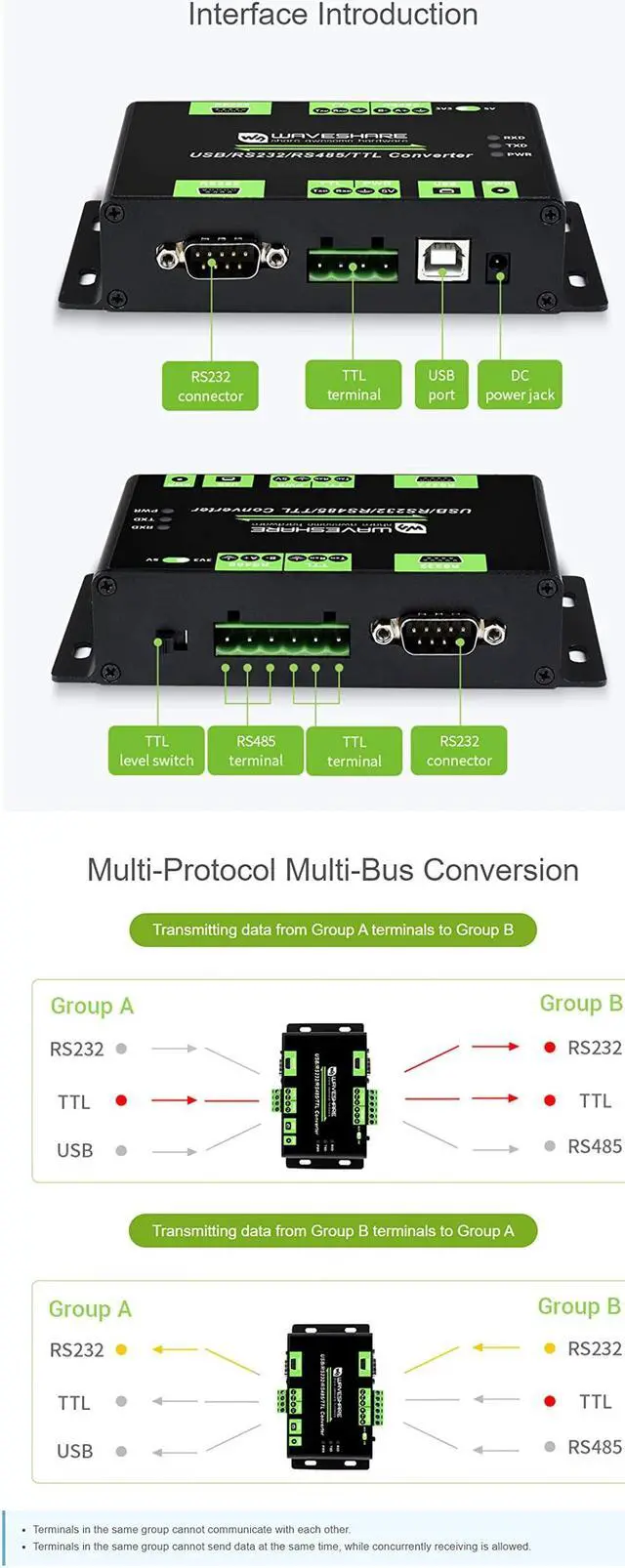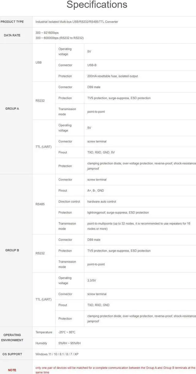 The USB/RS232/RS485/TTL Converter is an industrial grade isolated converter that supports USB / RS232 / TTL to RS232 / 485 / TTL, with built-in power supply isolation,