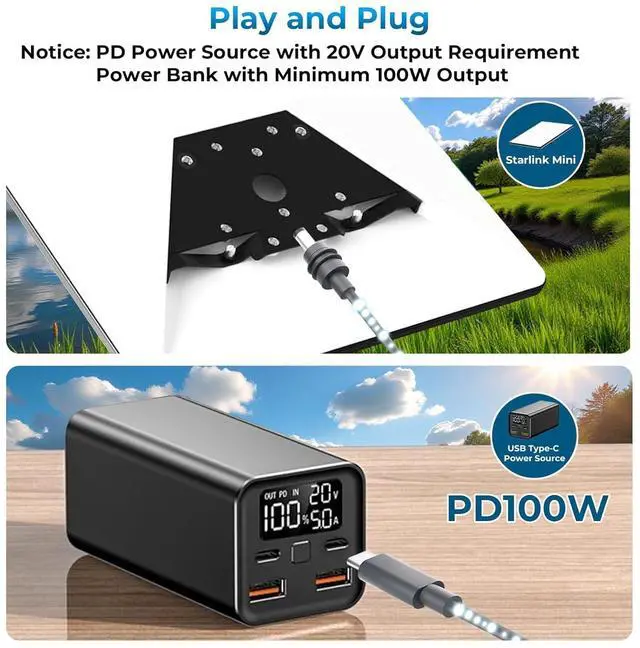 High-Powered Compatibility : This USB-C to DC cable 10FT works seamlessly with 100W power banks or PD chargers, delivering the consistent 20V power needed to keep your Starlink Mini online in any location