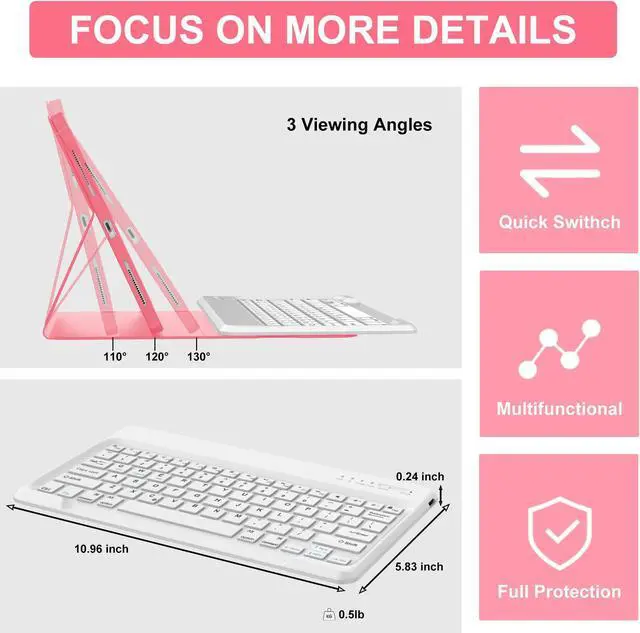 Rechargeable Battery - The keyboard case for iPad is built-in two large-capacity rechargeable batteries, and the charging time is only 2-3 hours, the standby time is up to 220 hours. Don't worry about frequent charging.