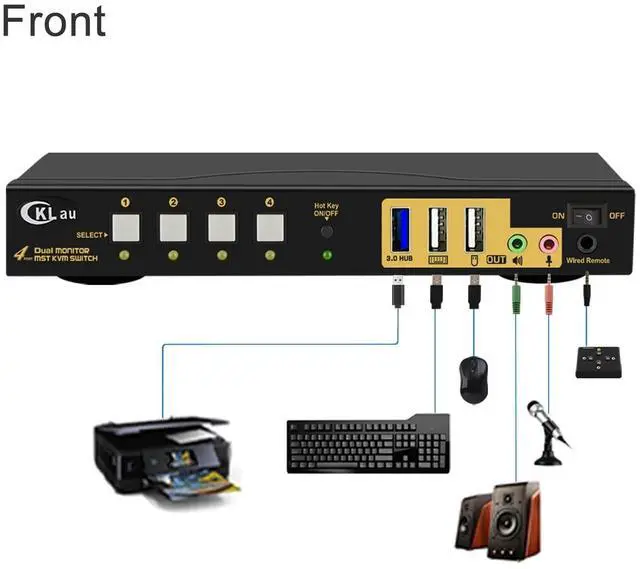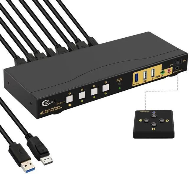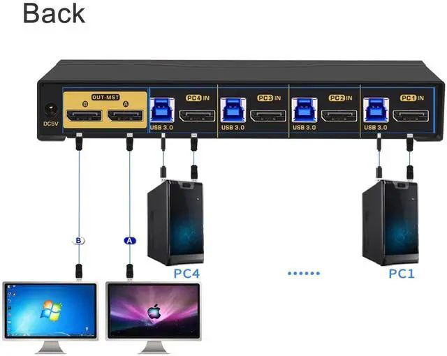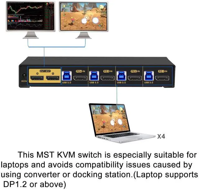 1. MST 4K KVM Switch: 1 Displayport in, 2 Displayport out. This MST KVM switch is especially suited for the laptop with a Displayport port output, to avoid compatibility issue cause by use an adapter / docking station(you should confirm your laptop supports DP 1.2 output). (Tips: This KVM switch doesn't support MAC laptops.)