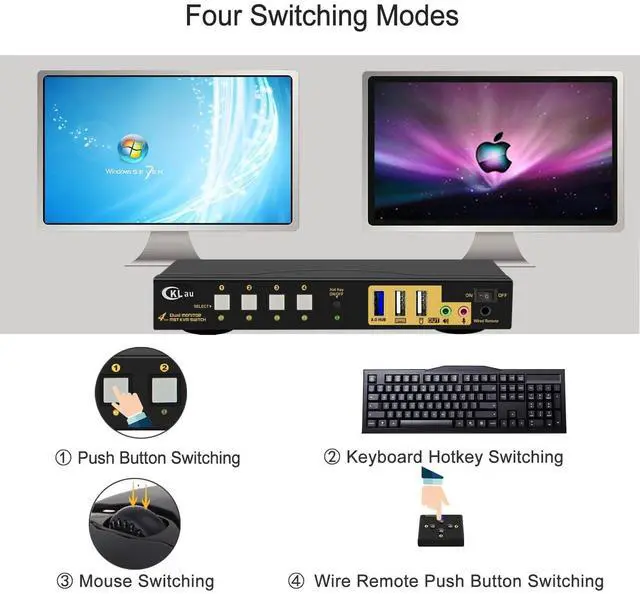 3. MST KVM Switch 4 Port: Supports four switching ways: Hotkey switching (Num Lock + Num Lock + 1 / 2 / 3 / 4 + Enter, or Ctrl + Ctrl + 1 / 2 / 3 / 4 + Enter, or Scroll Lock + Scroll Lock + 1 / 2 / 3 / 4 + Enter), mouse switching (click mouse wheel 2 times + left button / right button), manual button switching, wired remote push button switching. Support extended di