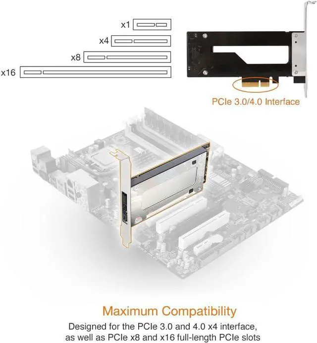 Use 1x PCIe 3.0 / 4.0 x4 interface, also supports installation into PCIe 3.0 / 4.0 x8 and x16 slots