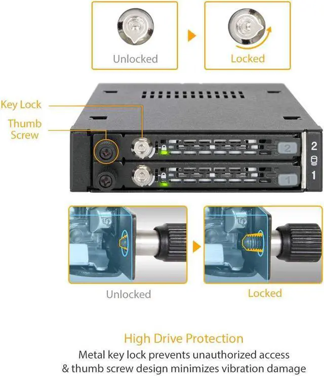 Dual Lock Design - Metal key lock (for drive security) and thumb screw lock (for impact/vibration)
