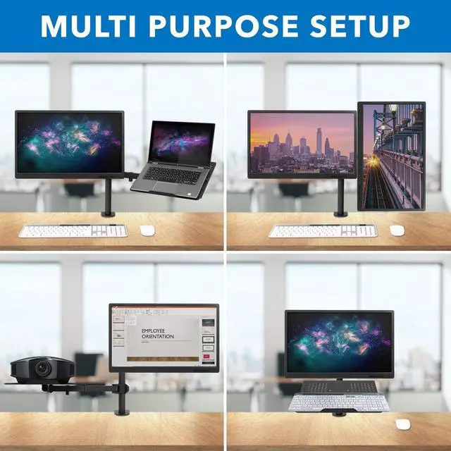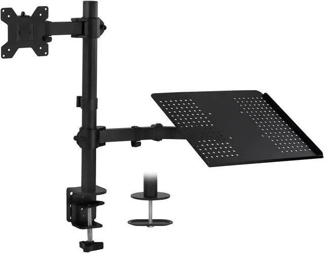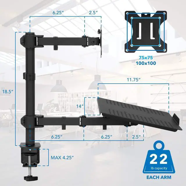 Monitor head can rotate 360 degrees to allow monitor rotation from landscape to portrait modes, without having to remove it. The vented tray supports notebooks up to 15 inches in screen size with with its platform size of 14 inch wide by 11.8 inch deep. The bottom portion of the platform has a lip to securely hold the laptop in place. Each arm can carry a total load capacity of 22 lbs. High-quality steel and Aluminum materials ensure durability and elegant looks. Sturdy double-clamp base does not require special tooling and can be safely connected to desks up to 4 inches in thickness.