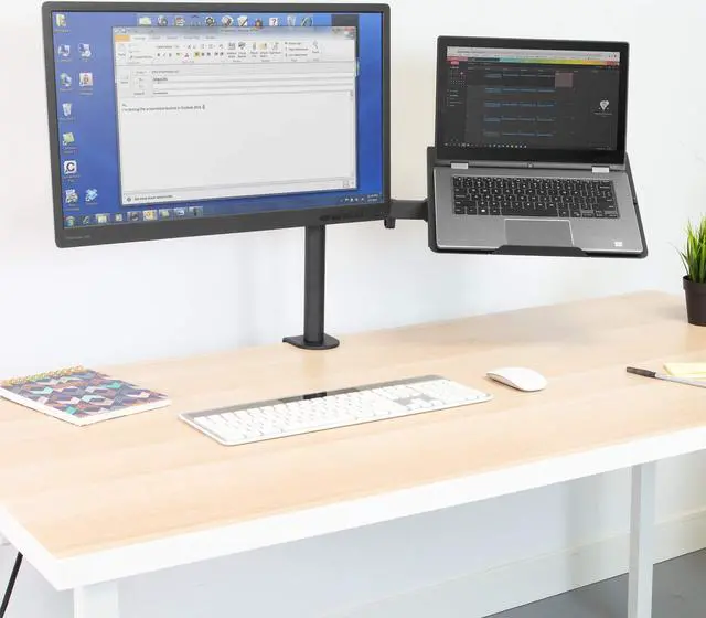 MI-4352LTMN laptop and monitor desk mount combo helps reduce the risk of back and neck injury that is common with hours of sitting in an incorrect body posture. By raising the laptop computer to an ergonomic height you can create additional desk space while lifting the screen to an optimal user height. Adding a monitor next to a laptop increases productivity by at least doubling the screen size. A perfect solution for limited space applications by removing clutter from the desktop, using work space effectively and mounting laptop computers conveniently. Cable management clips helps organize cables running to the computer.
