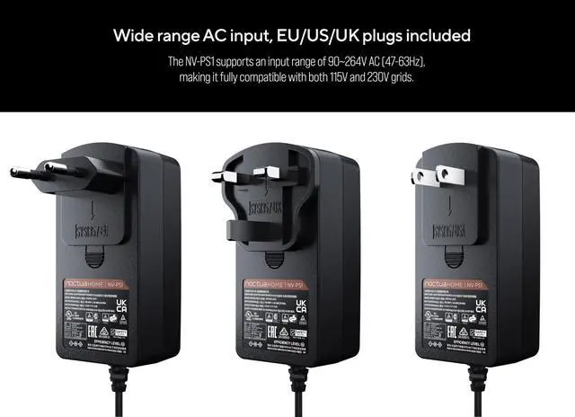 Premium-quality NV-PS1 power supply with wide range 230/115V input, EU, UK and US socket adaptors included, UL certified for guaranteed safety