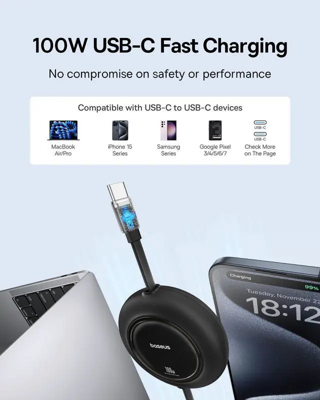 Clutter-Free Desk Setup: Say Goodbye to Tangled Cables and a Messy Charging Environment. Pull the Retractable Type C Cable to Retract and Store for Ease of Storage.