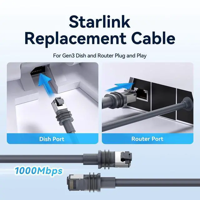 Full Compatibility with Starlink Gen3Only Designed specifically for Starlink Gen3 routers and terminals. Cat5e starlink cable Features advanced 50 RJ45 connectors with 24K gold-plated contacts that integrates with Gen3s WAN/LAN ports. Tested to meet Starlink V3s strict power and data transmission standards.