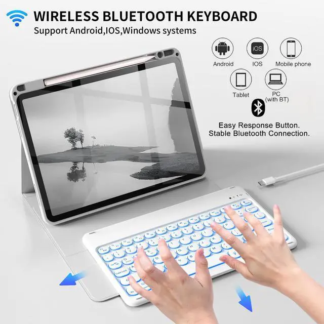 7 Colors Backlit Keyboard- This iPad keyboard case is designed with laser-etched backlit keys that allow 7 different colors to glow in the dark, making glow typing more fun and easier. You can choose your favorite color to bring you a different visual enjoyment.