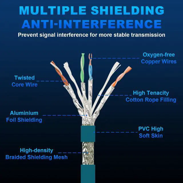 High performance signal transmission; Our M12 X Code 8 Pin Male to RJ45 Ethernet cable is designed with a twisted pair and double shielded construction, incorporating a pure copper wire core and high density tinned shield; This structure minimizes signal crosstalk, delivering more stable and faster data transmission, ensuring optimal performance for all your industrial network needs
