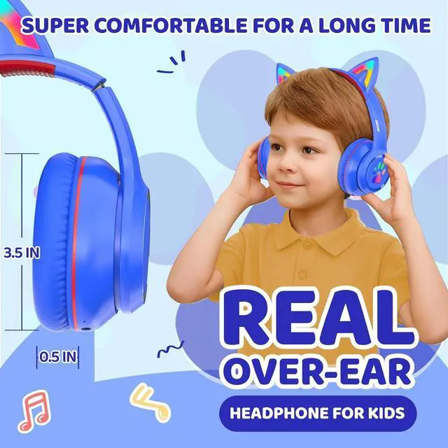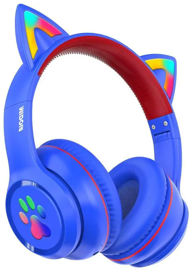 MIDOLA Kids Headphones Cat Ear Wireless Bluetooth 5.3 60H Over Ear, 8H with Led Light Foldable Headset with Aux 3.5 mm Mic for Travel Pad Tablet Blue