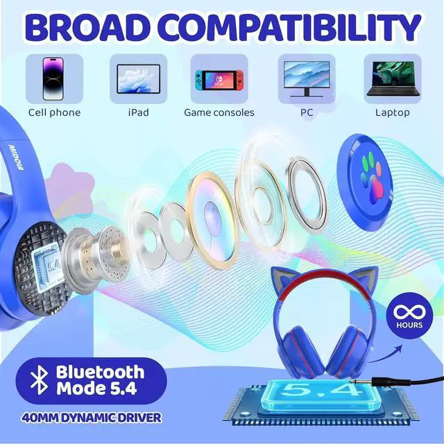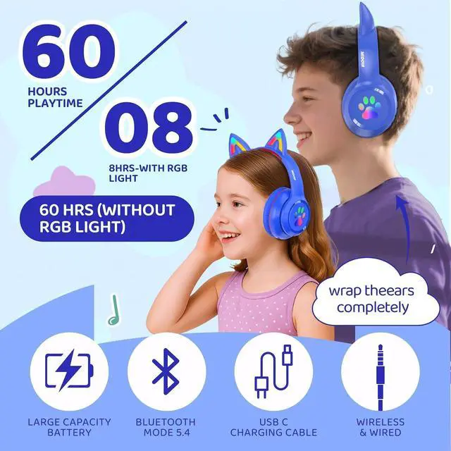 Multifunctional Bluetooth 5.3 Led Light Cat Ear Headphones: (8hrs-with RGB light) for 60 hrs (with RGB light) playtime Bluetooth headphones(hands-free calling) /Or Aux-in.It can listen anytime in both a wired and wireless capacity. The wireless design is handy for avoiding tangles, and this cord is detachable.