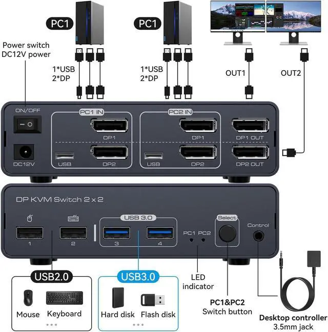 [(KVM Switch Displayport)] The KVM switch allows 2 computers to share 2 monitors and 4 USB ports, including support for devices such as mice, keyboards, printers and external hard drives. It offers Extended Mode (which allows you to move application windows from the main screen to the secondary screen to increase work efficiency) and Duplicate Mode (which allows you to mirror images on both monitors). Make sure your signal source supports multi-screen display. Note: To output to two monitors, the DP1 and DP2 ports must be connected to the same computer