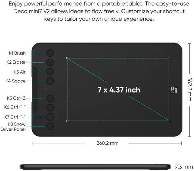 XPPen Updated Deco Mini7 V2 Drawing Tablet-16384 Levels of Pressure Battery-Free Stylus, 7 x 4 OSU Drawing Pad, 8 Hotkeys for Digital Art, Teaching, Gaming Graphic Tablet for Chrome, PC, Mac, Android