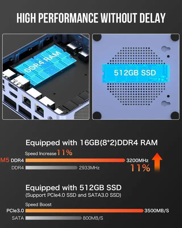 16GB DDR4 RAM & 512GB PCIe SSDInstalled with DDR4 16GB RAM Dual Channel (2x8GB), the Nucbox M5 Plus mini pc support expansion to 64GB RAM. Featured with 512GB M.2 2280 PCIe 3.0 SSD, support dual slot expansion to 4TB SSD. (Upgrades not included)