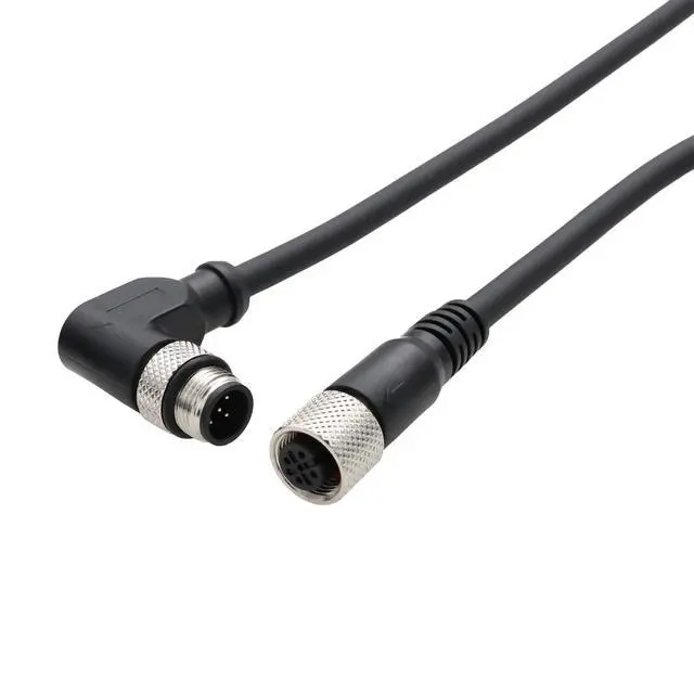 M12 A-coded aviation connectors, 5 pin male 90-degree right angle to 5 pin female straight. Supports 60V AC/DC and 4A current for space-saving power/data transmission, with 12mm locking thread, solid and durable connection, gold plated contact