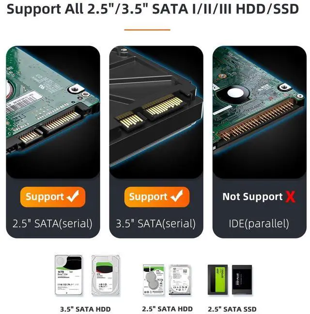 CompatibilityThis hard drive enclosure supports 2.5 and 3.5 inch SATA HDD and SSD (Support hard drive in size 7-15mm)