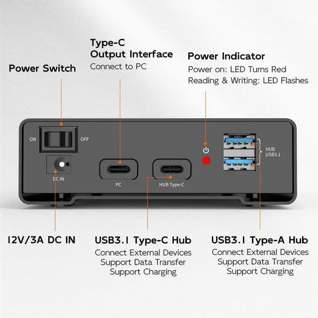 HUB Extension & StackableThis 2.5 3.5 inch SATA SSD/HDD case has two 10Gbps USB3.1 Type-A hub ports and one 10Gbps USB3.1 Type-C hub port, supports HUB extension. And the caddy comes with USB-C to USB-A data cable. They are also stackable, support daisy chain, you can combine multiple enclosures to expand storage for your devices.